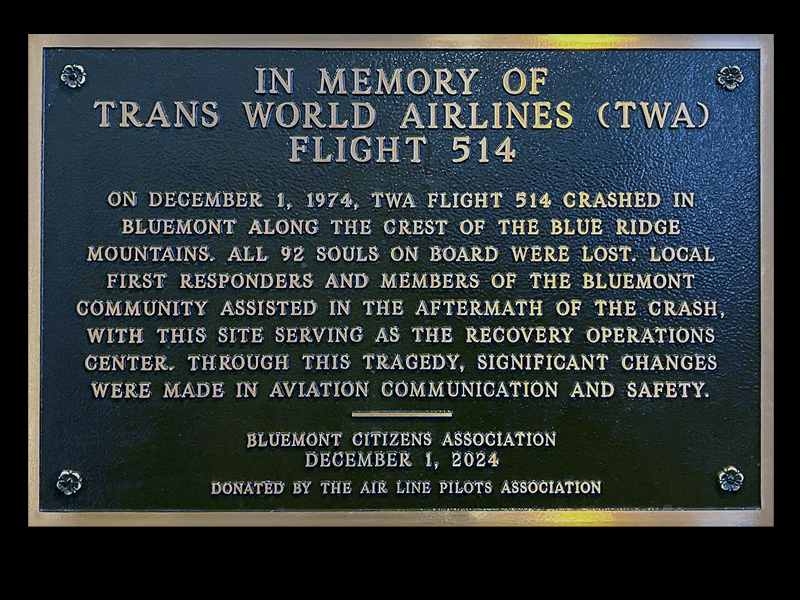 A bronze plaque commemorating the TWA Flight 514 accident was unveiled by memorial organizers inside the Bluemont Community Center. Nearly 300 people, including family, friends, first responders, and community members, gathered in Bluemont, Va., on Dec. 1, 2024, to remember the victims of Trans World Airlines (TWA) Flight 514, which crashed on a nearby slope of Mount Weather on the crest of the Blue Ridge Mountains in December 1974, killing all 85 passengers and seven crewmembers on board. The commemoration, which took place on the 50th anniversary of the accident, was organized by members of the Bluemont Citizens Association with support from ALPA and other airline industry, aviation safety, and community groups.