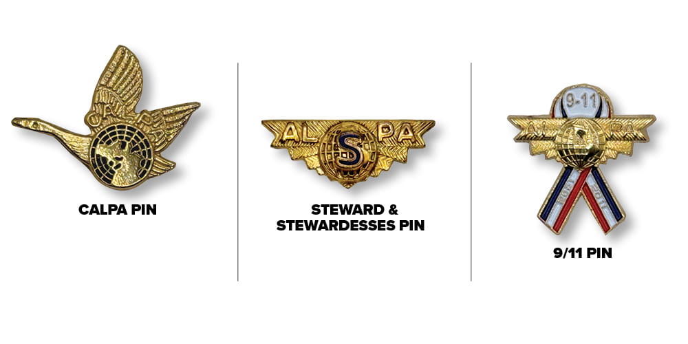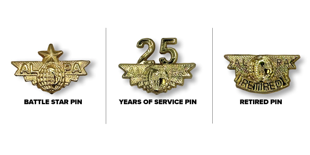 On this page are photographs of pins throughout ALPA’s history as well as variations for certain circumstances. Need a pin? Fill out the form at alpa.org/pins to request one.