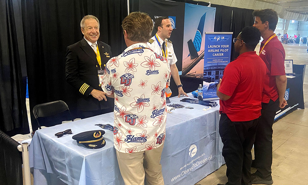 Throughout the week, Education Committee members Capt. Fred Kopec (Delta) and Capt. Jeffrey Gilbert (Endeavor Air) staffed a booth to connect with students between events and hosted an evening pizza forum to answer questions about the profession. Students expressed excitement in getting to talk with professional airline pilots and actively sought career advice. They also participated in a building competition using ALPA-branded materials while waiting for the weather to clear.