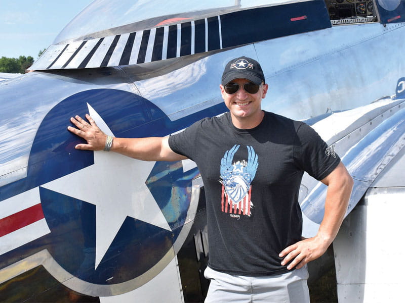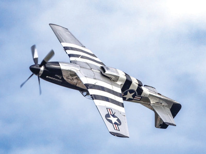 “This particular P-51 is a celebration of our nation’s armed forces,” Yoak said, noting that the entire paint scheme—from the black and white stripes on the wings to the feathers at the back of the canopy—serves as a tribute to the veterans of World War II. He has more than 1,000 hours flying Mustangs and holds a surface level aerobatic waiver, allowing him to fly his aircraft at “unrestricted” altitudes during his public aerial performances.