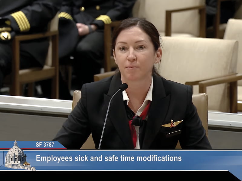 F/O Laura Haynor (Delta) appeared before the Minnesota Legislature on March 5, urging state senators to right a wrong that had been committed the previous year. In 2023, Minnesota passed the Omnibus Jobs Act, which included provisions for earned sick and safe time (ESST) benefits. ESST, which went into effect in January, guarantees Minnesota workers much-needed time off for illness, sick family members, and other outlined family needs. Haynor noted that the bill unfairly excluded airline pilots and flight attendants.