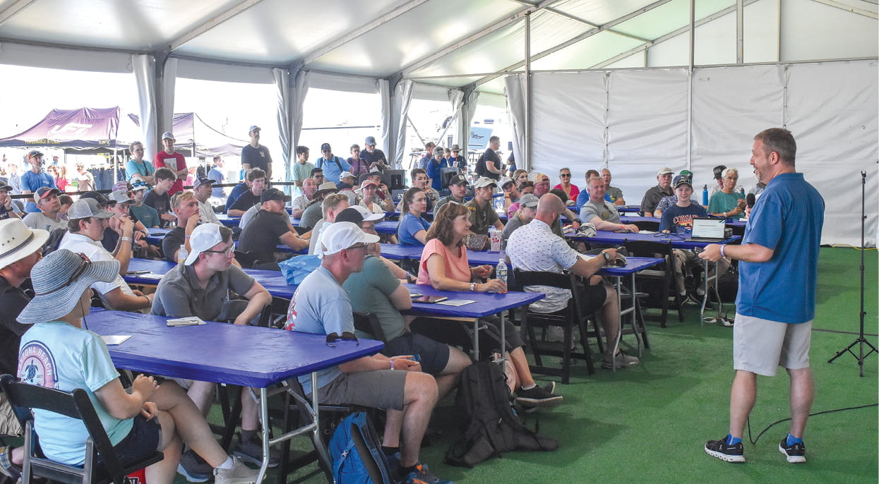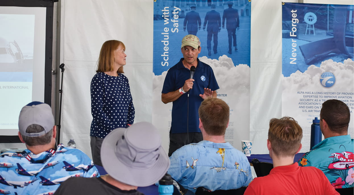 The frequent whirring of propellers and the roar of jet engines overhead served as a backdrop for daily pilot presentations, which took place in the theater portion of ALPA’s outdoor booth. These 30-minute discussions were conducted by ALPA committee leaders and experienced line pilots, drawing large audiences and generating lively postsession conversations.