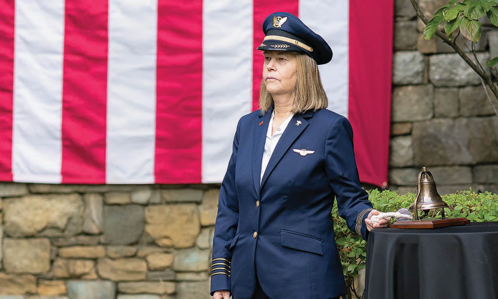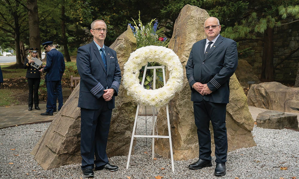 As Ambrosi paid tribute to each of the crewmembers and other employees aboard the four 9/11 flights by reading their names aloud, Capt. Wendy Morse, ALPA’s first vice president and national safety coordinator, tolled a bell for each. Capt. Sean Creed, ALPA’s vice president–administration/secretary, and Capt. Wes Clapper, ALPA’s vice president–finance/treasurer, placed a wreath at the center of the Remembrance Garden in their collective honor as “Amazing Grace” played.