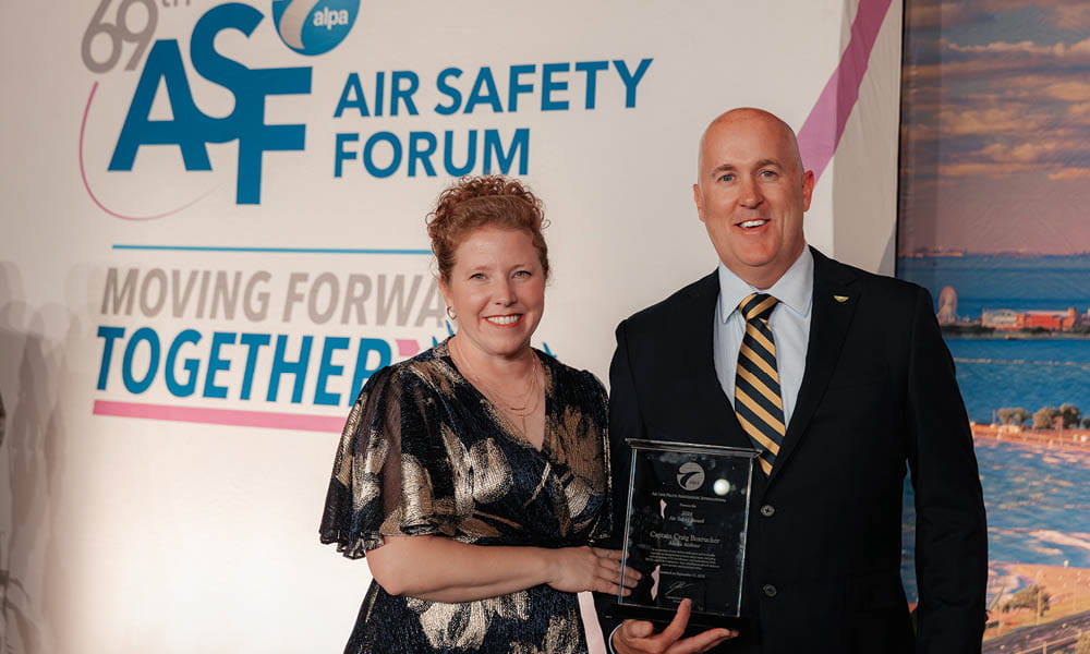 Accepting on behalf of the crew, Docherty emphasized the importance of support after the incident. “The first call I received was from our Critical Incident Response Program chair. He was an amazing resource I relied on for weeks. That support, along with the work of FOQA, my colleagues, and my family, was truly helpful in processing what happened.” He added, “Having two pilots on the flight deck on this day was why we were able to safely complete this flight. And I thank all of you who are still working to ensure that doesn’t change.”