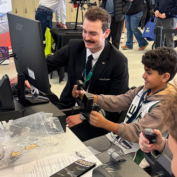 Education Committee member F/O Mitch Murgoitio (United) led a seasoned team of volunteers that included Capt. Kayle Thompson (Delta) and F/Os Brooks DeSpirito (Frontier), Sean Richmond (Frontier), and Nolan Walters (Frontier). Joining the pilots were nine dedicated collegiate aviators involved with Purdue Professional Pilots, the student organization ALPA partners with to bring its professional development and mentoring program on campus. Together, they engaged with hundreds of visitors throughout the day.